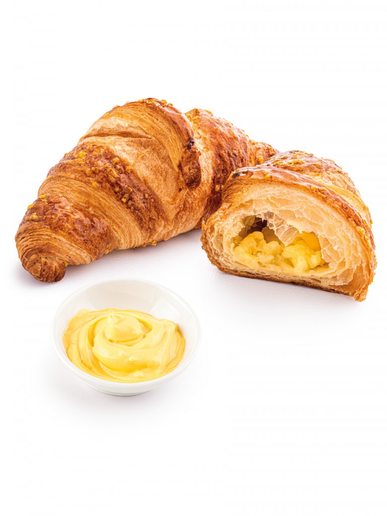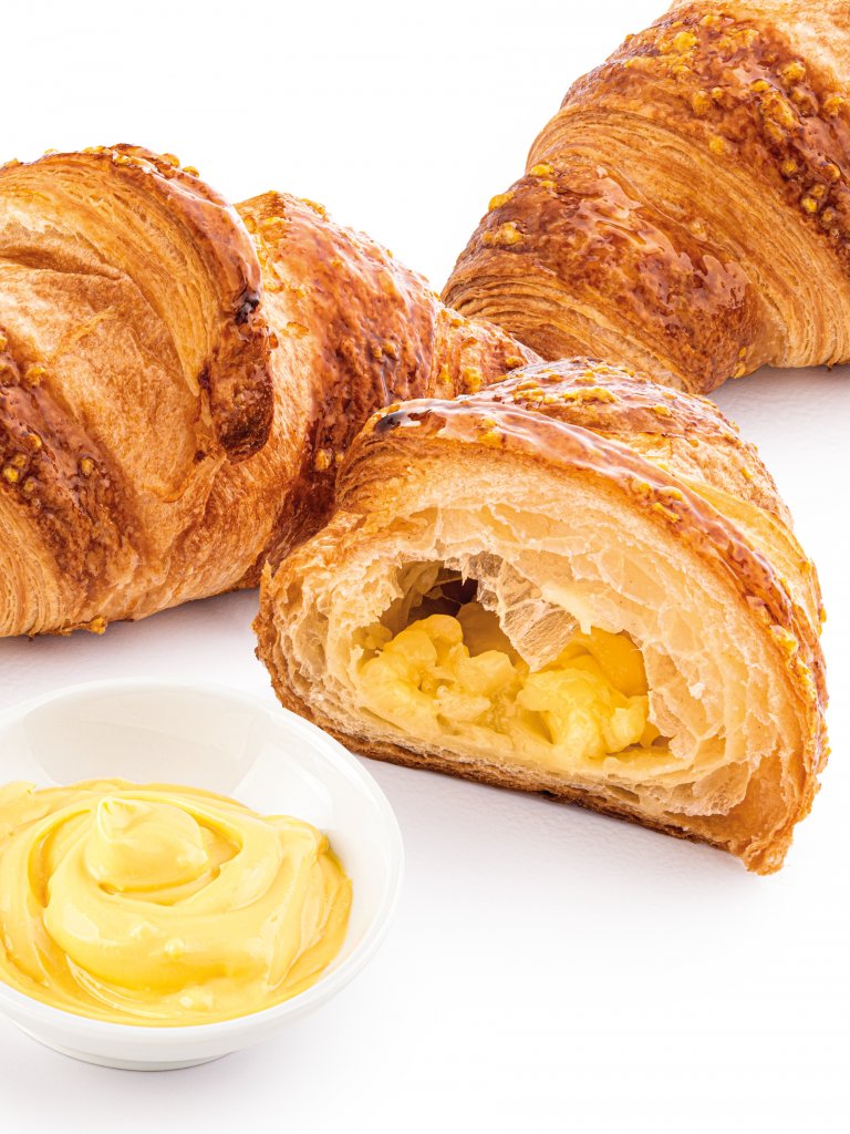 Per chi sceglie la fragranza della sfoglia con il 19,5% di burro e la corposità di un impasto arricchito di uova e zucchero. La presenza del lievito madre gli conferisce una maggiore leggerezza e gli dona un sapore tutto naturale. Farcito con deliziosa crema pasticcera e rifinito con perline di zucchero giallo.