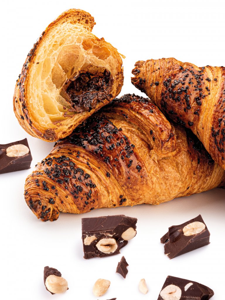 Per chi sceglie la fragranza della sfoglia con il 19,5% di burro e la corposità di un impasto arricchito di uova e zucchero. La presenza del lievito madre gli conferisce una maggiore leggerezza e gli dona un sapore tutto naturale. Farcito con una cremosa crema di nocciole e rifinito con scagliette di cioccolato.