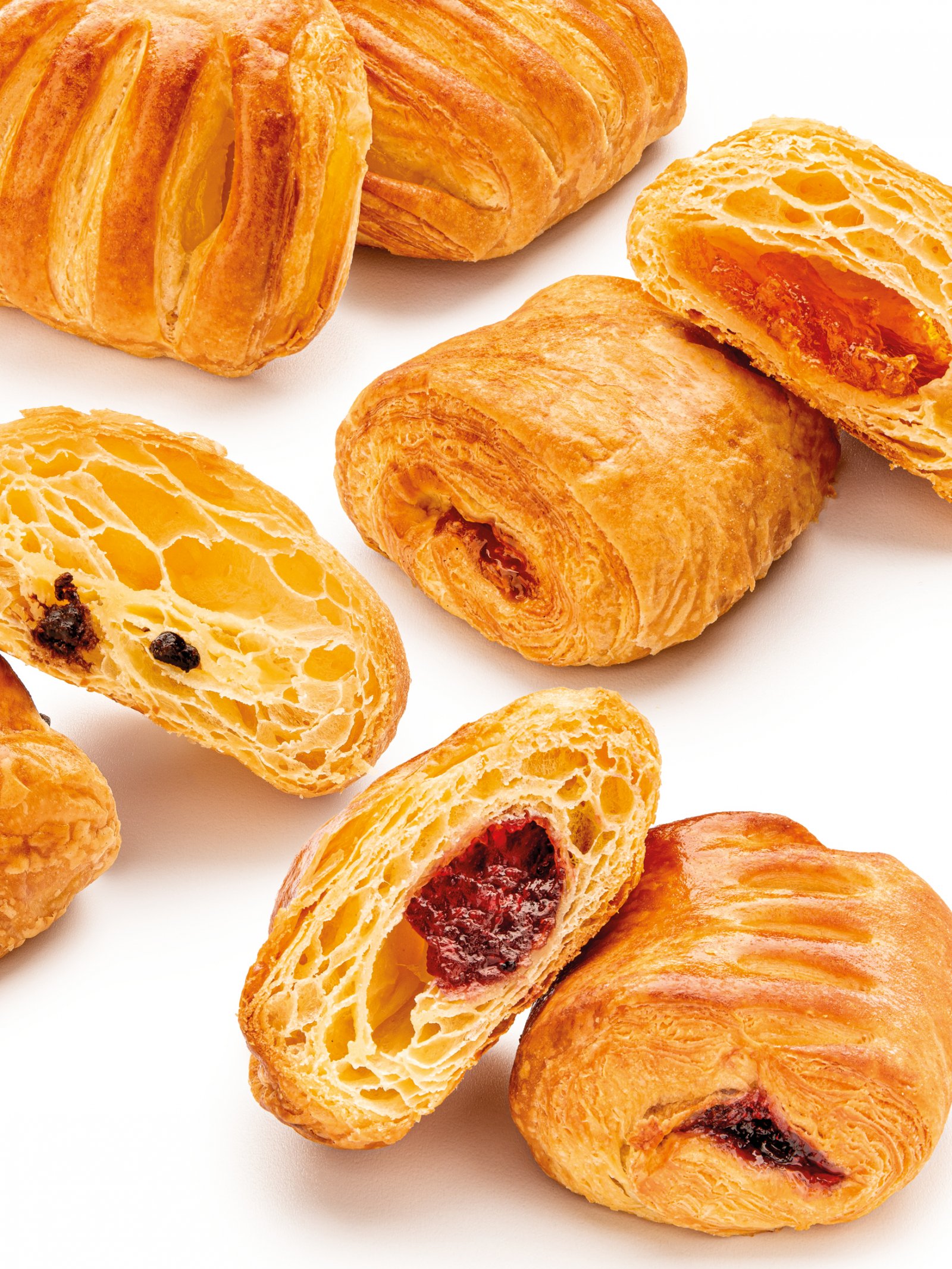 Un ricco mini mix di fragranti paste lievitate con quattro farciture diverse per soddisfare ogni gusto: confettura di albicocca, crema pasticcera, confettura di frutti di bosco, gocce di cioccolato.