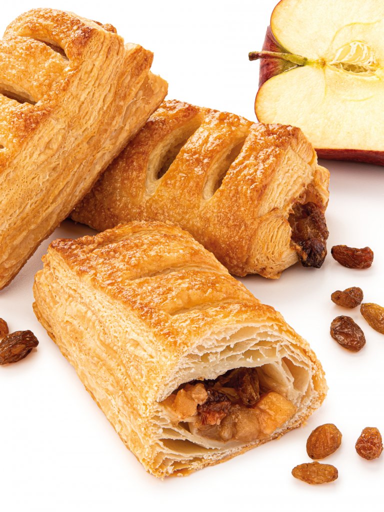 L'impasto sfogliato e friabile al profumo di limone è farcito con dolci cubetti di mele di origine italiane e uva sultanina. Un classico delle tradizione dolciaria al profumo crema di mele cotte e cannella