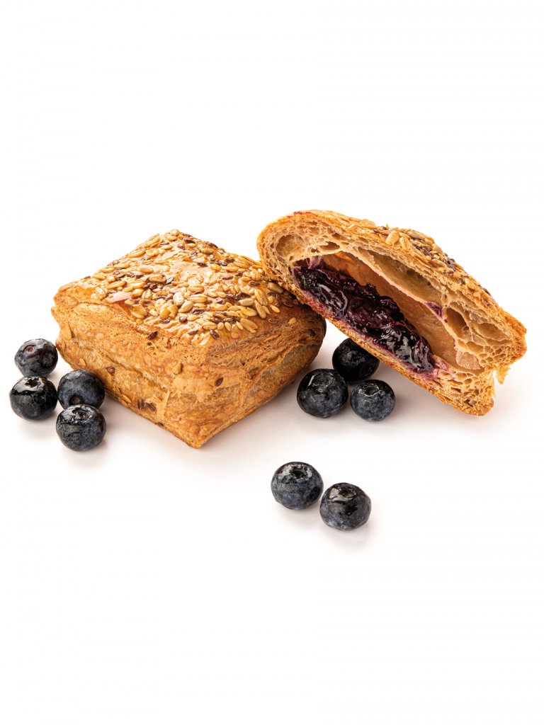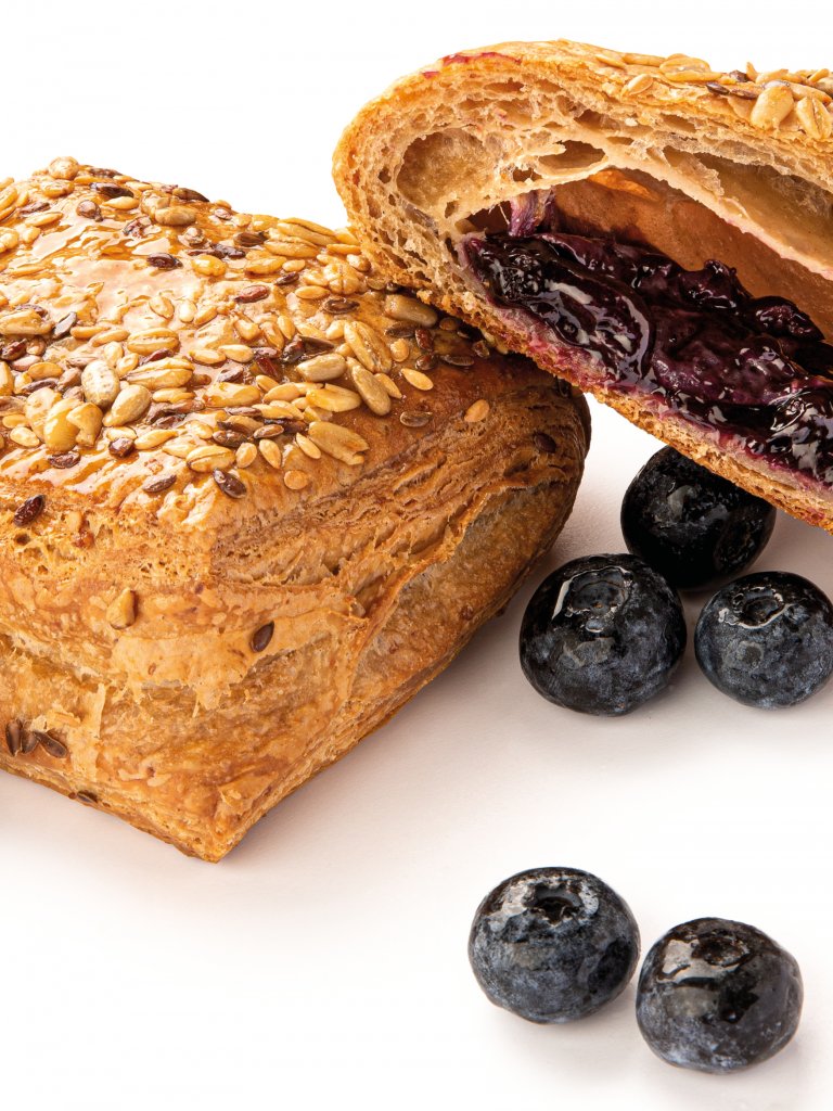 Creazione di fragrante pasta lievitata arricchita con burro ottenuta con un sapiente mix di cereali antichi come farro e segale. Decorato in superfice con semi di girasole, lino,sesamo e fiocchi di avena, conserva al suo interno una farcitura ai mirtilli selvatici che gli dona un profumo di bosco e grano duro.