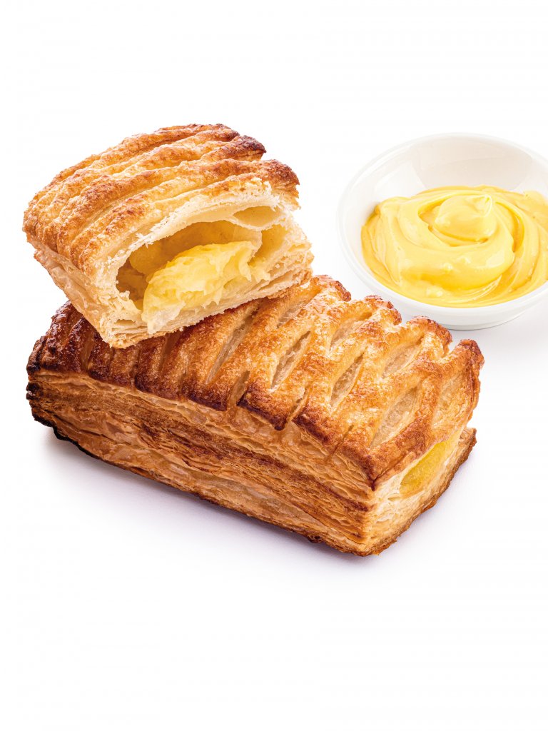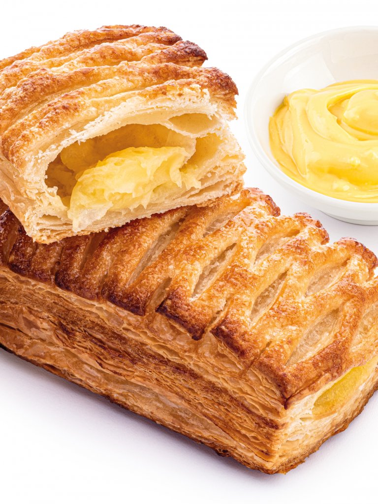 Creazione di pasta sfoglia dorata e croccante dalla forma rettangolare con farcitura abbondante di crema pasticcera al gusto vaniglia. Decorata in superficie con zucchero.