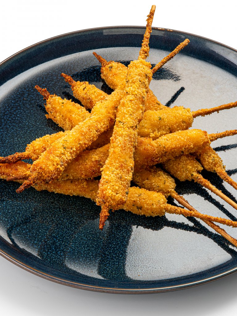 Gustoso piatto a base di filetto di totano gigante del Pacifico sottoforma di arrosticini. Perfetto per essere servito come secondo a cena, come aperitivo ricercato o croccante finger food. La panatura esalta il sapore intenso del totano.