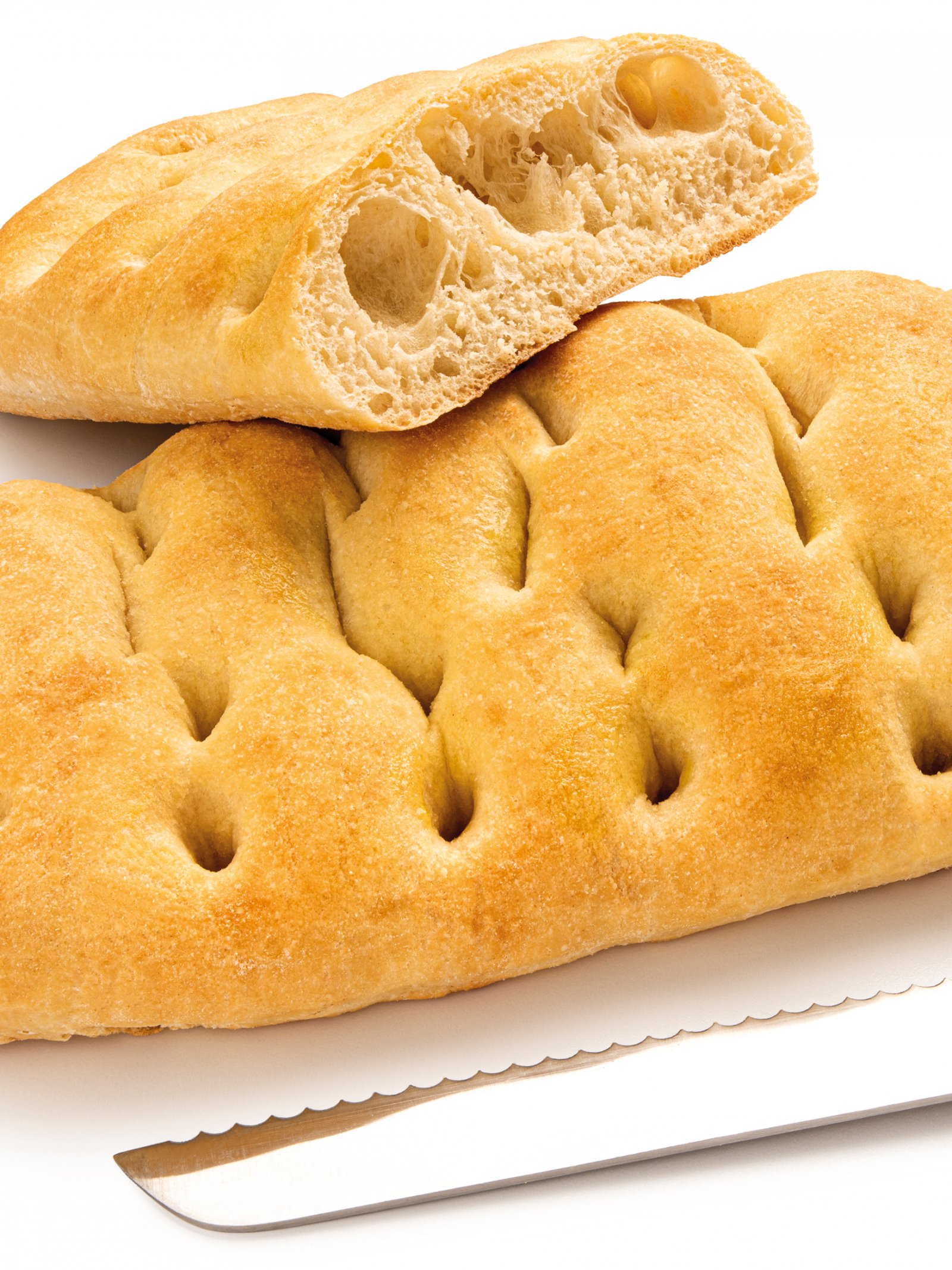 Una ricetta originale, una focaccia schiacciata a mano e cotta su pietra ollare. Con aggiunta di olio extra vergine d'oliva che dona un impasto soffice. I solchi in superficie donano elasticità e un leggero strato più croccante in superficie.