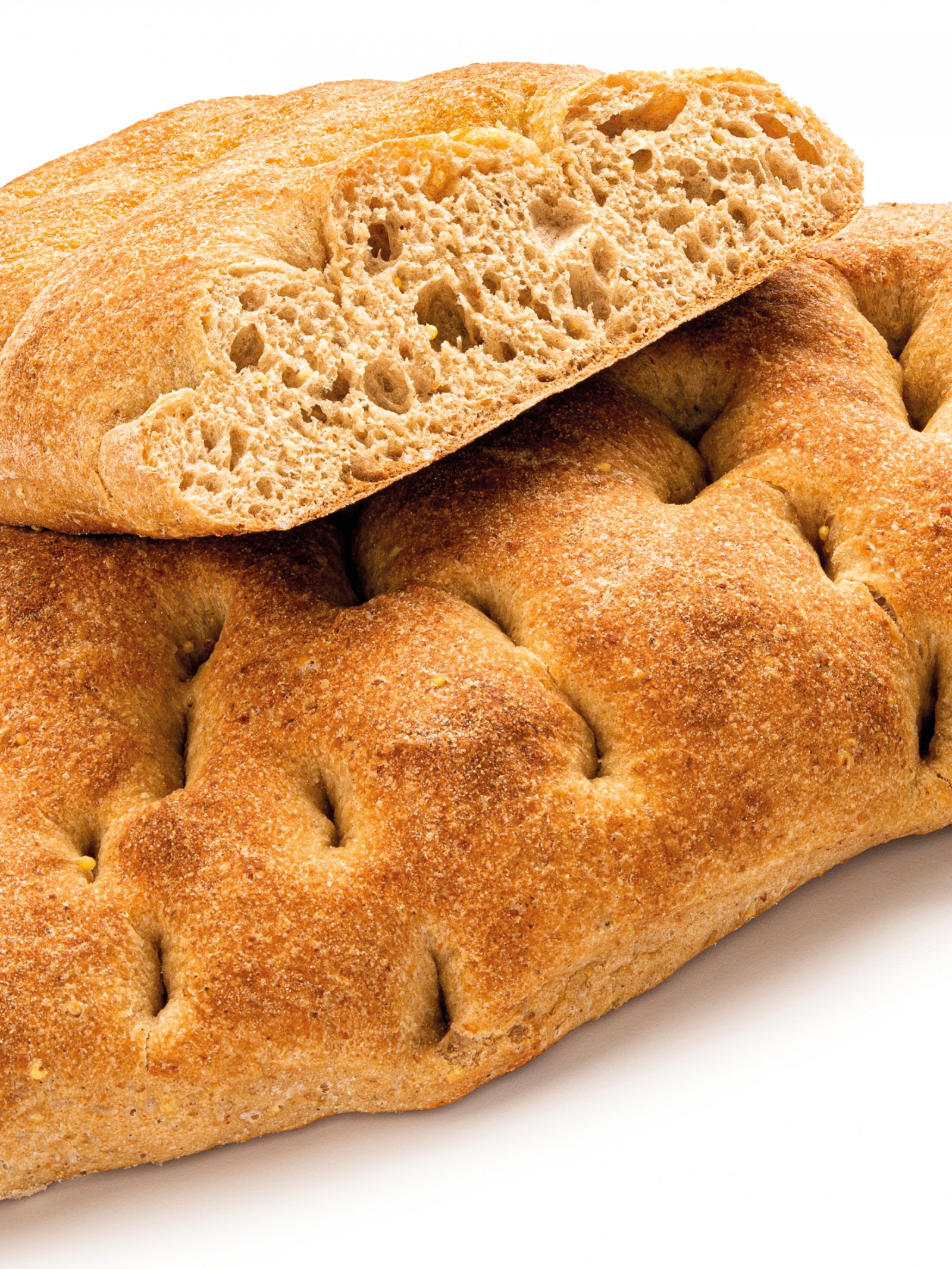 Una ricetta originale, una focaccia schiacciata a mano cotta su pietra ollare e un impasto multicereali ricchi di fibre, con aggiunta di olio extra vergine d'oliva che dona un impasto soffice. I solchi in superficie donano elasticità e un leggero strato più croccante in superficie.