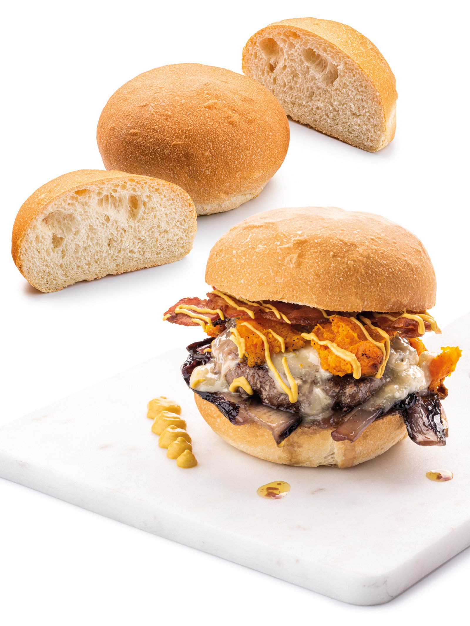 Il nuovo Bun artigianale presenta una struttura tonda, molto alta, con interno morbido e crosta molto croccante, capace di accogliere al meglio la carne e i vari condimenti, rendendo il panino hamburger un’equilibrata esplosione di gusto. Il sapore è neutro come il pane fresco appena sfornato, il Bun Artigianale è ideale per tutte le preparazioni di panini grazie al suo sapore unico, tale da renderlo anche un perfetto sostituito del pane fresco.