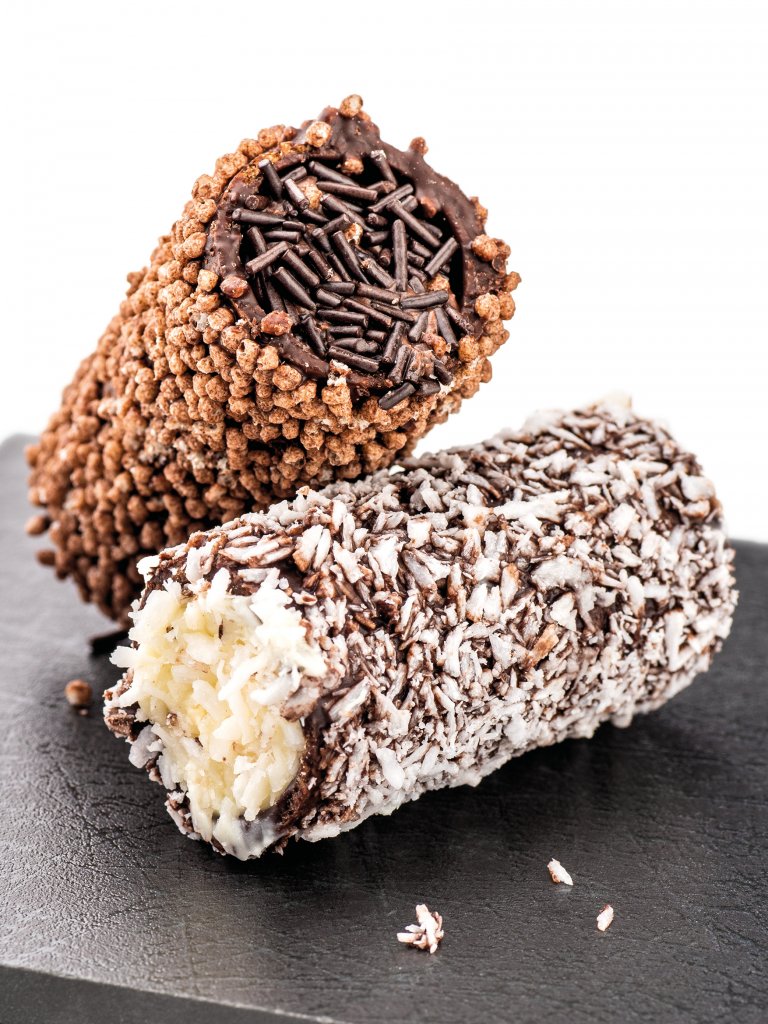 Incredibili cialde a base burro dalla consistenza fragrante farcite con crema gianduia e crema al cioccolato bianco, ricoperti da granella di cocco per la versione bianca e da praline al cioccolato per la versione al cacao.