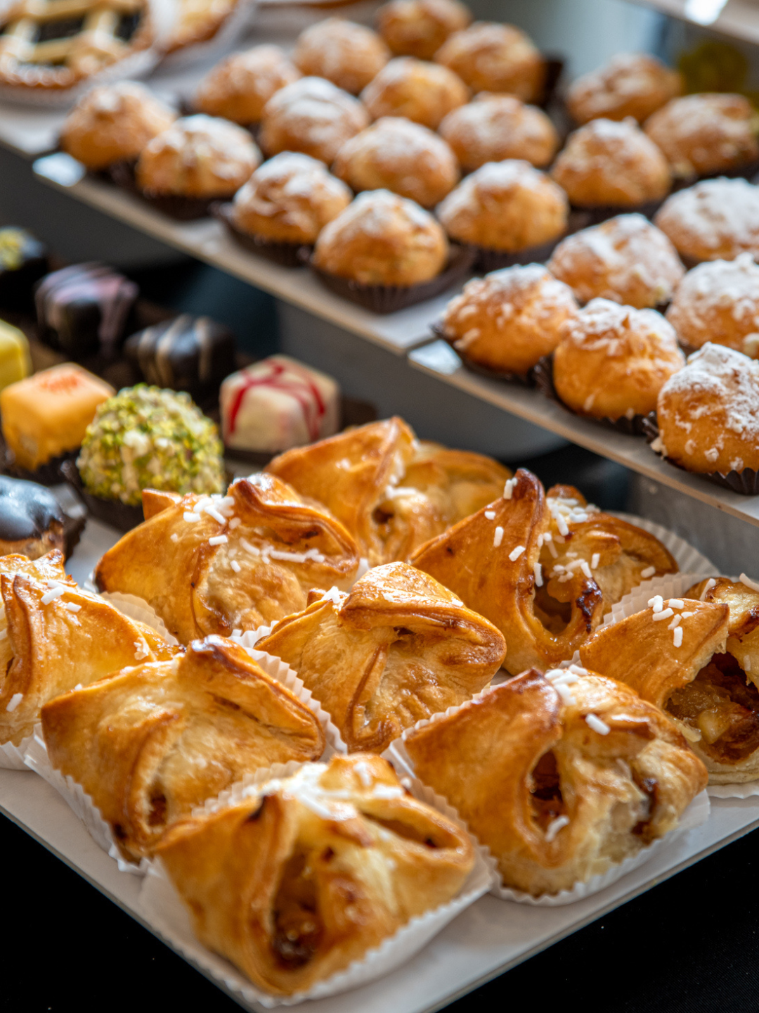 Cartoccini di sfoglia friabili e irresistibili, farciti con mele morbide, uvetta e una cremosa confettura all’albicocca. Un mini strudel. Un vassoio da 20 pezzi da