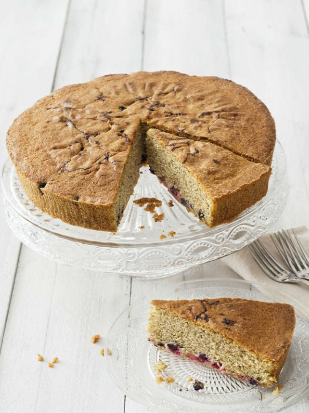 Morbido impasto misto con grano saraceno, decorato con mirtilli e ribes. Soffice e non asciutta, dal gusto rustico e confortevole. Ideale da gustare per la colazione oppure come snack dolce per una deliziosa pausa. Per un accompagnamento più raffinato e per dare un tocco speziato e ancor più goloso a questa magnifica torta, si consiglia di abbinarla con una panna semi montata alla cannella non zuccherata.