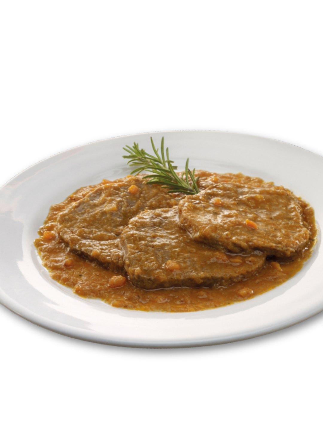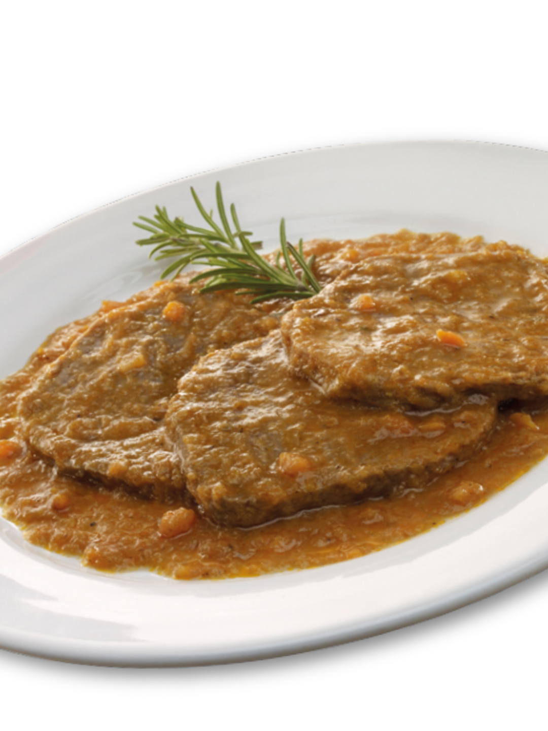 Tenera carne di bovino a lenta cottura, avvolta da un sugo di verdure sfumato con vino rosso. Perfetto da abbinare con la polenta (fritta o al cucchiaio), patate o purè.