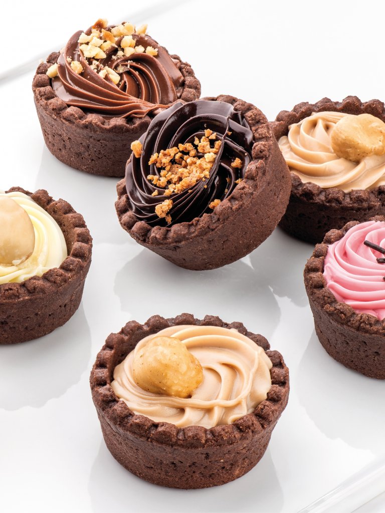 Piccoli cestini di friabile pasta frolla al cacao. L'impasto a base burro gli dona una consistenza quasi cremosa, farciti con diverse creme come cioccolato fondente, nocciola, pistacchio, fragola, gianduia e gianduia bianco. Ogni tartellina presenta una decorazione in accordo con la farcitura. Un'ampia offerta che si adatta a qualsiasi momento della giornata.