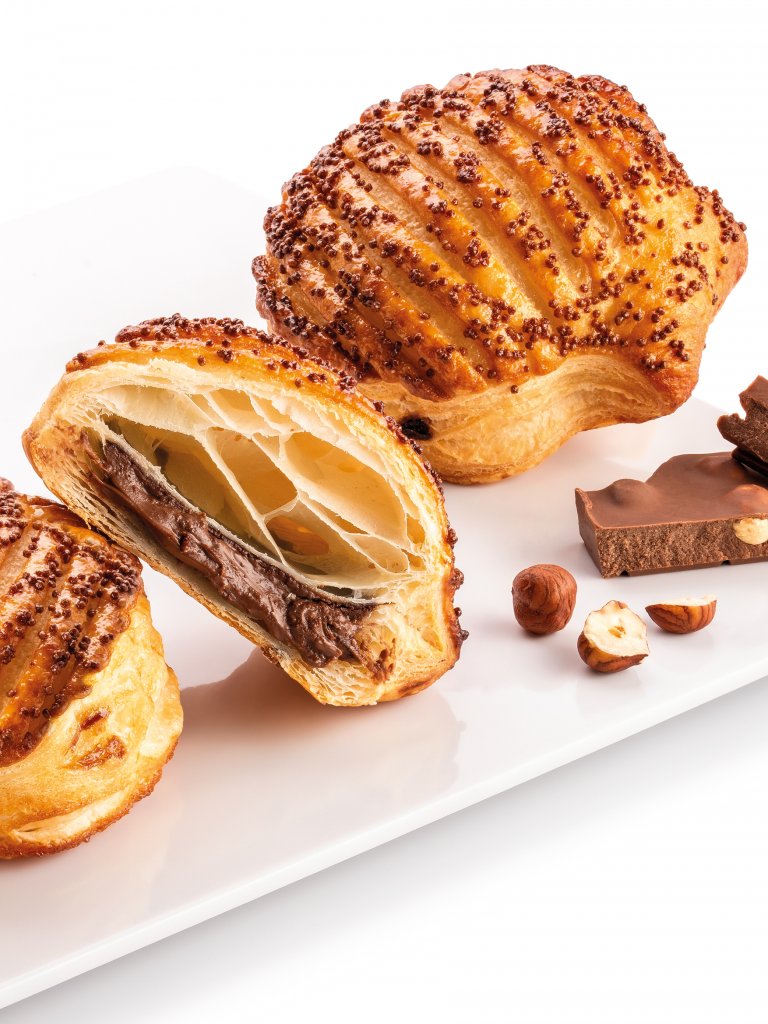 La migliore pasta sfoglia al burro: delicata, friabile e dorata incontra un ripieno equilibrato e molto gustoso alla crema di nocciola. La forma è tipica e riconoscibile di conchiglia, una creazione originale e deliziosa, unica nel suo genere.