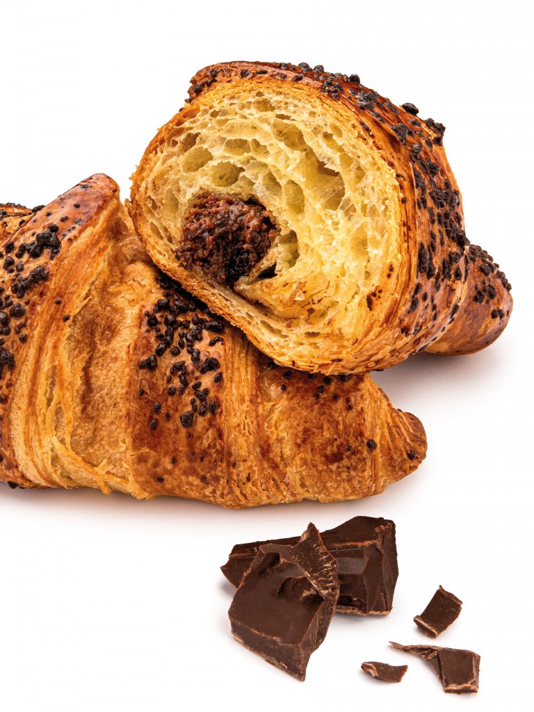 Un incontro tra burro e margarina perfettamente equilibrato dona una pasta sfoglia friabile, dorata e brillante. Il Croissant Cioccolato Harmonie offre un volume generoso e una grande alveolatura interna, farcito con crema di cioccolato e nocciole da punta a punta per un gusto ricco e un odore avvolgente di cacao e lievemente tostato di nocciola. Decorato in superficie con scagliette di cioccolato.
