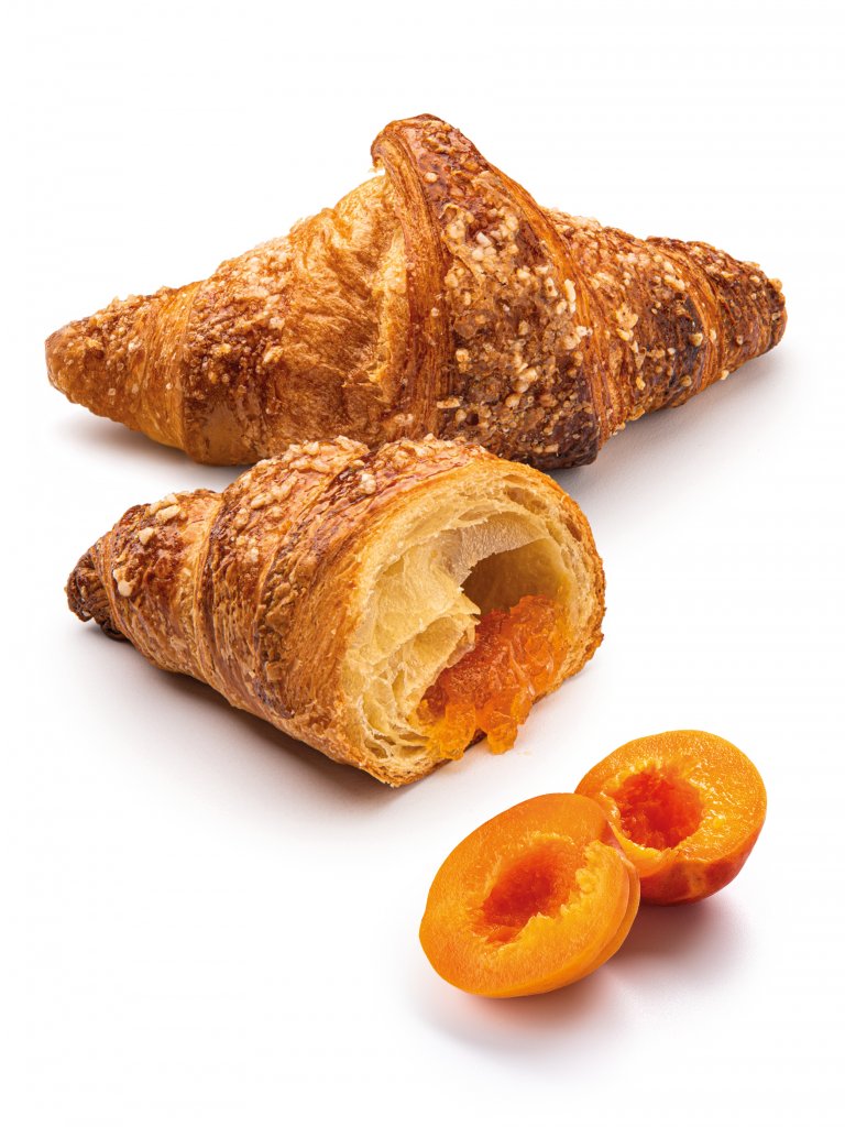 Un incontro tra burro e margarina perfettamente equilibrato dona una pasta sfoglia friabile, dorata e brillante. Il Croissant Albicocca Harmonie offre un volume generoso e una grande alveolatura interna, la ricchissima farcitura di albicocca è tutta italiana per un gusto dolce e fresco e un odore fragrante e fruttato. Decorato in superficie con granella di zucchero.