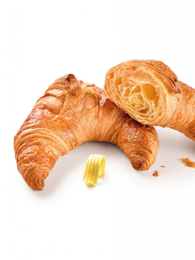 Croissant vuoto curvato a mano come da tradizione. L' impasto al burro al 24% è arricchito da zucchero, uova e aroma panettone e offre una sfoglia leggera dall'alveolatura ampia. Un mix tra tradizione italiana e alta pasticceria francese per questo croissant dal profumo agrumato e lievemente vanigliato.