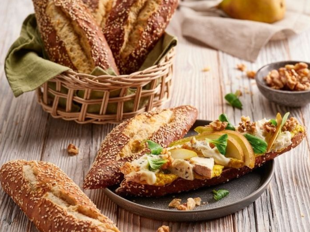 Baguette con crosta dorata-scura con topping di  sesamo e sale.
