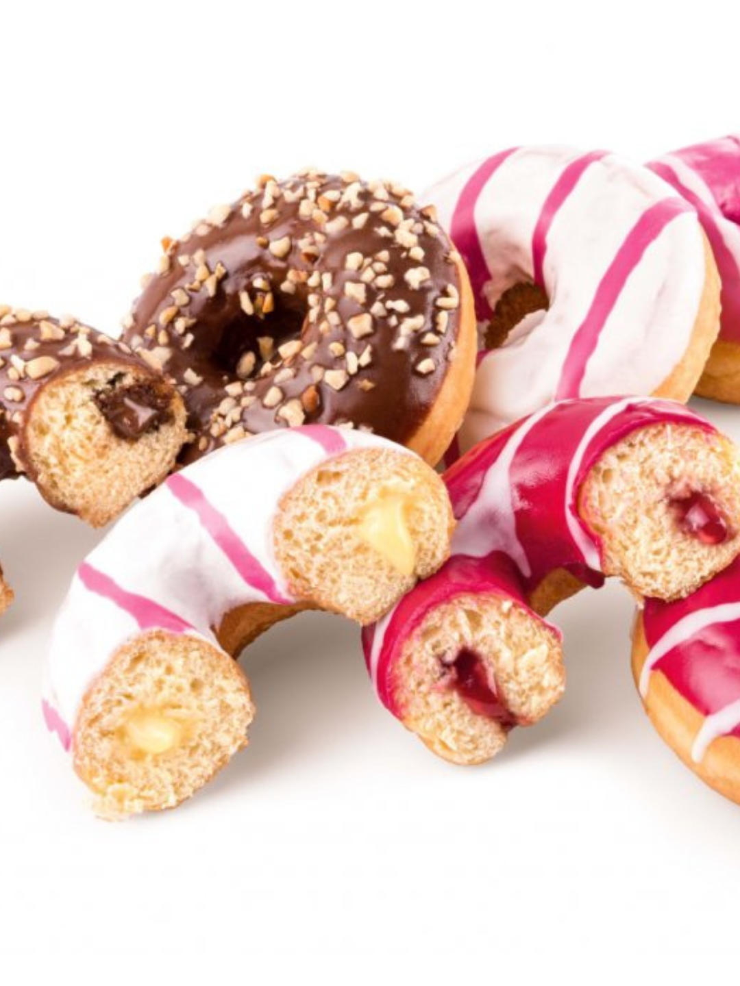 Un mix speciale che soddisfa tutti i gusti, per non rinunciare ad un'offerta completa. Pasta krapfen nella classica forma a ciambella americana, 4 deliziose farciture e glassature: crema pasticcera, frutti d ibosco, cioccolato e nocciola, lamponi.