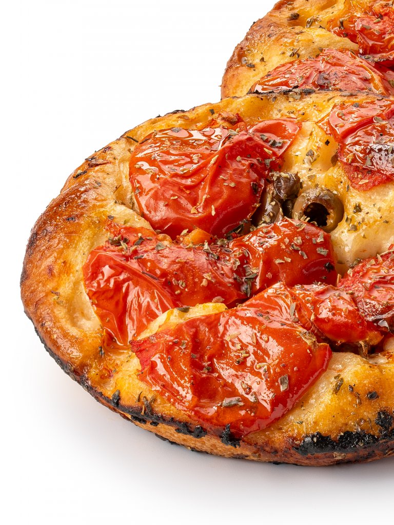 - Delizioso topping con pomodori freschi italiani, olive baresane (tipiche del territorio pugliese) e origano