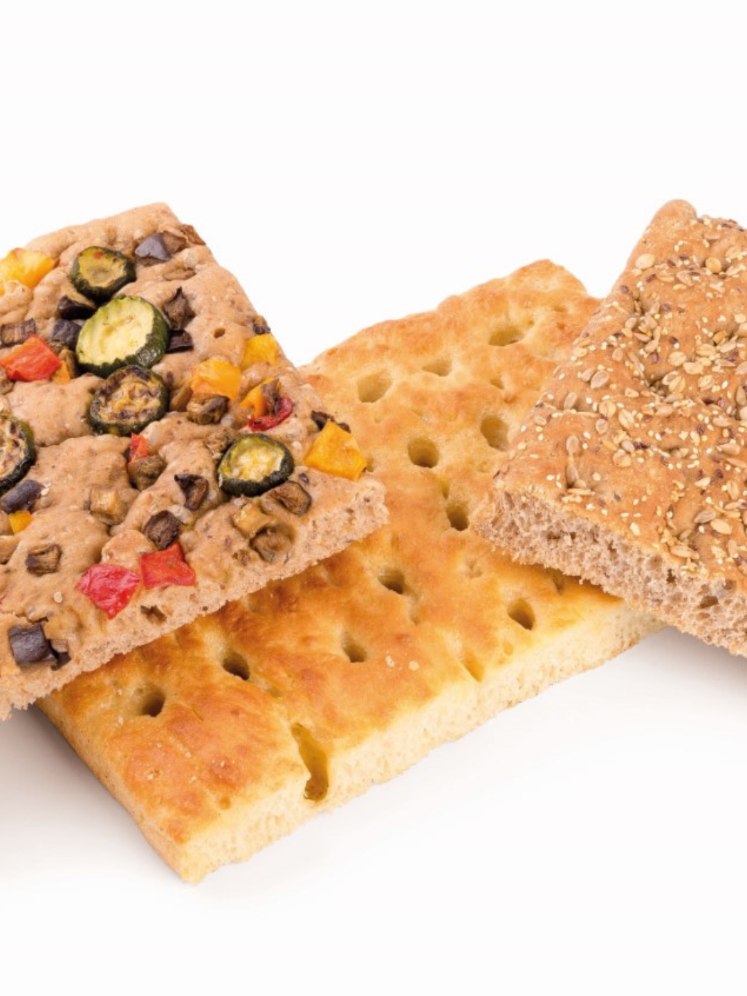 La focaccia che mette d'accordo tutti, ricetta artigianale con biga e stiratura a mano che la rende soffice e croccante al contempo. La superficie è cosparsa con una miscela di olio extra vergine di oliva, acqua e sale per un effetto lucido e per esaltarne il sapore.