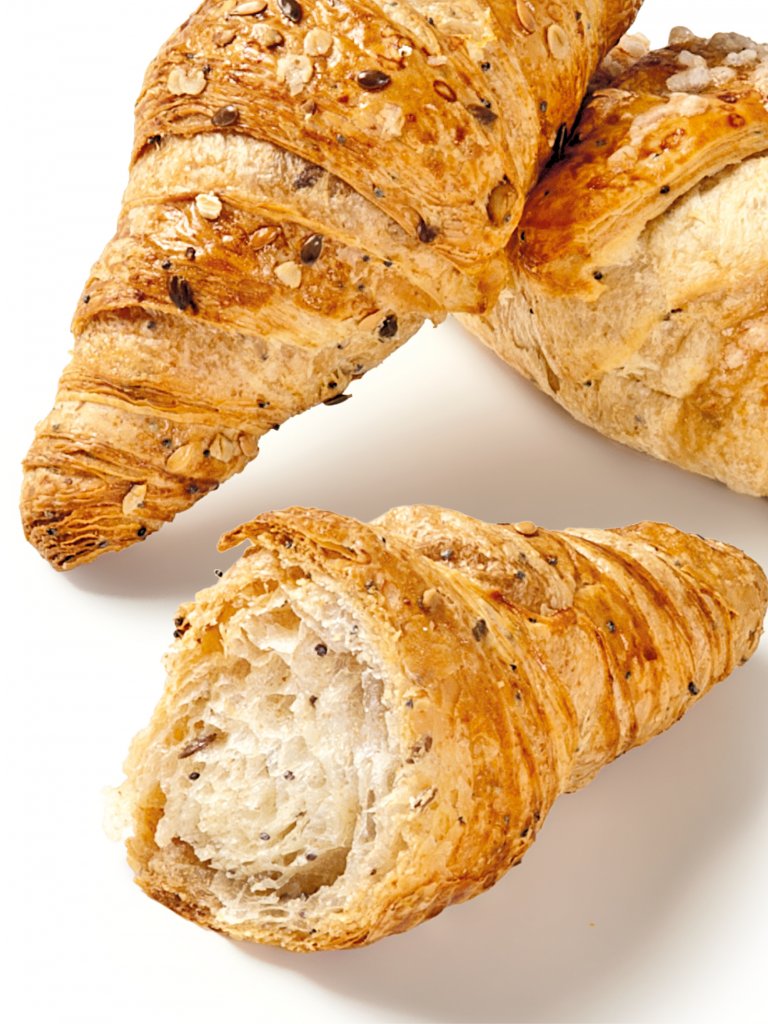 Fonte di fibre con farina integrale e mix di semi: papavero, girasole e lino scuro in questo mini croissant integrale eccezionale. Ideale da servire dolce o salato grazie alla sfoglia lievemente salata con il 20% di burro.