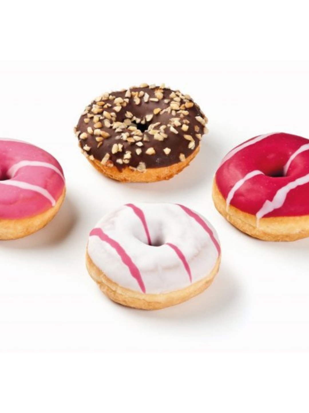 Un classico della tradizione dolciaria americana in versione mini. Pasta krapfen con la classica forma a ciambella, 4 varianti di glassatura e farcitura per soddisfare ogni richiesta: mini donut con farcitura al cacao e nocciole con glassatura al cacao e decorazione di nocciole, mini donut con farcitura e glassatura alla crema pasticcera, mini donut con glassatura e farcitura ai frutti di bosco e mini donut con glassatura e farcitura ai lamponi.