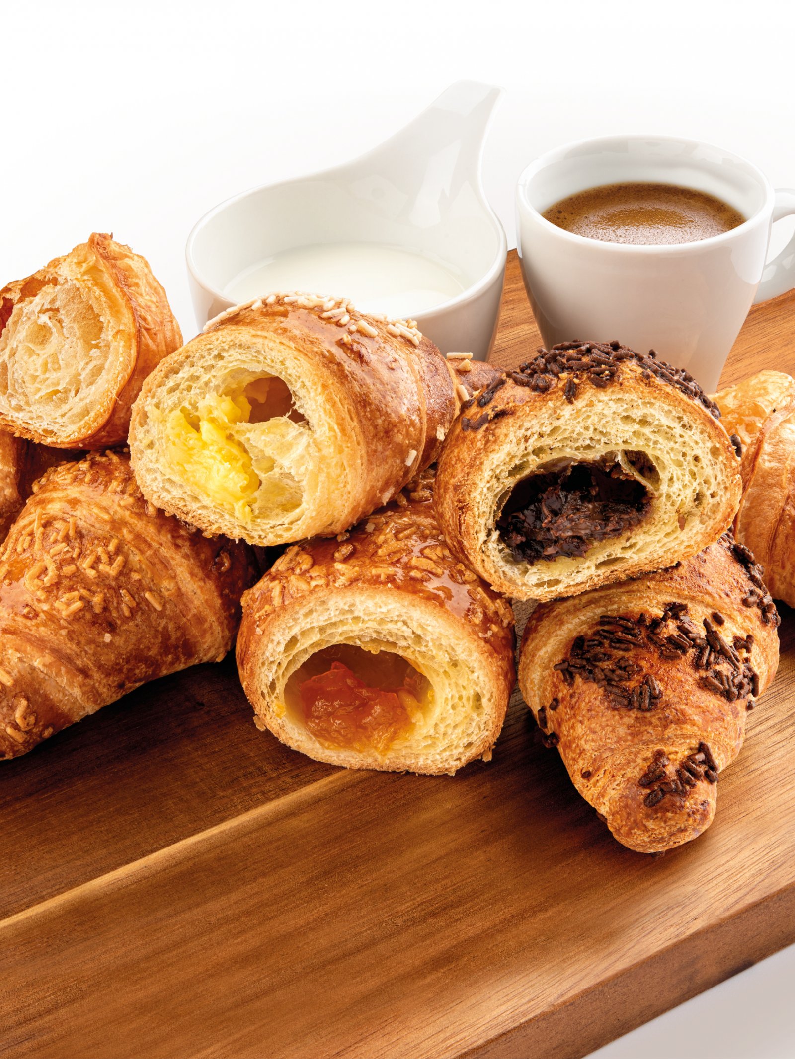 Una gamma di quattro mini croissant dall'impasto morbido e leggero grazie al sapiente mix melange che gli dona un sapore molto gradevole nella versione vuoto e unisce il dolce della crema pasticcera, della crema al cioccolato e della confettura di albicocca nelle versioni farcite.