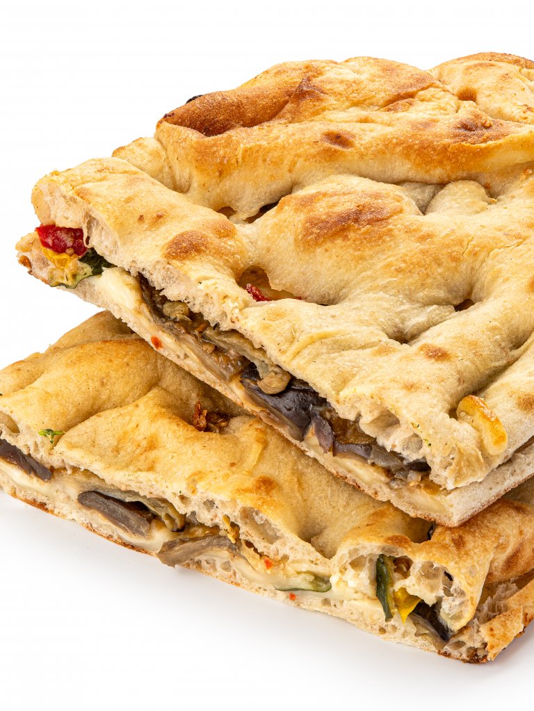 Un capolavoro della tradizione rustica romana, questa focaccia ripiena nella versione vegetariana conquista al primo morso con la sua consistenza irresistibile: una crosta dorata e friabile, che racchiude un ripieno sorprendentemente ricco di sapore. Il suo cuore racchiude melanzane, zucchine e peperoni – perfettamente bilanciati con la cremosità filante della mozzarella, la sapidità del formaggio e la nota decisa dell’olio Evo.