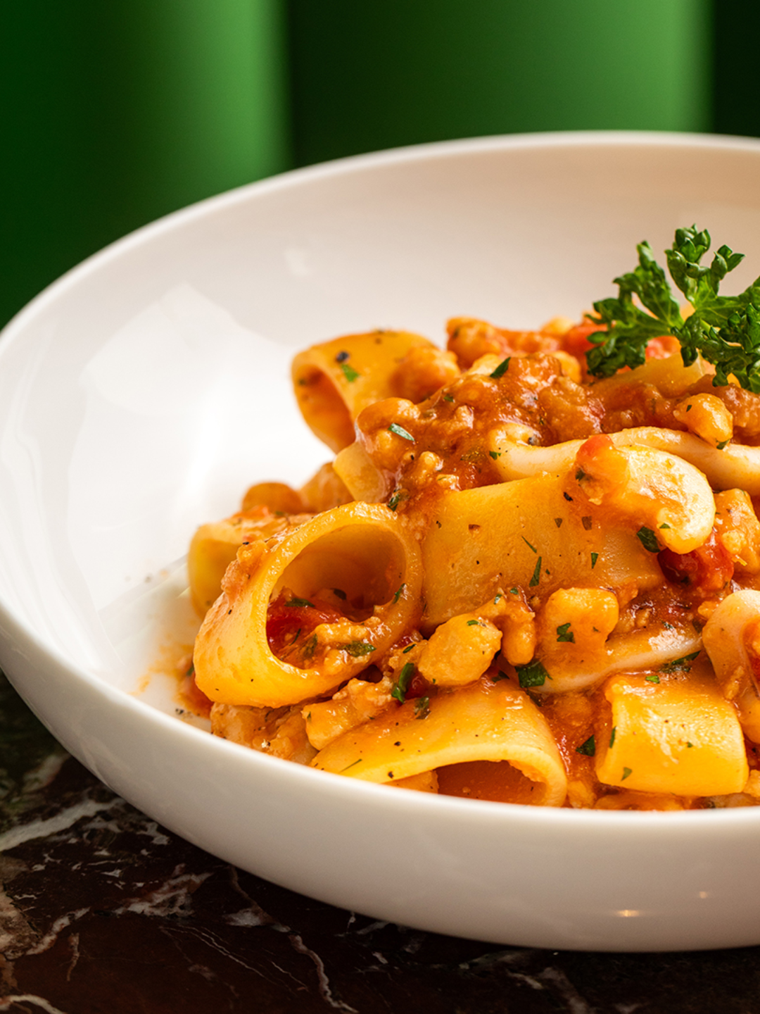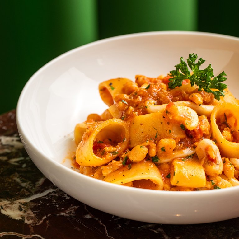 Un incontro di sapori marini avvolge delicatamente ogni boccone di questa prelibatezza culinaria. I mezzi paccheri, con la loro forma generosa e la consistenza avvolgente, si fondono armoniosamente con un ragù di seppia ricco e corposo, creato con cura artigianale.