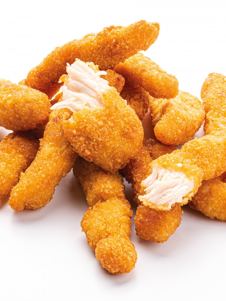 Striscioline di pollo panate, croccanti e gustose sono perfette per arricchire aperitivi o come finger food.
