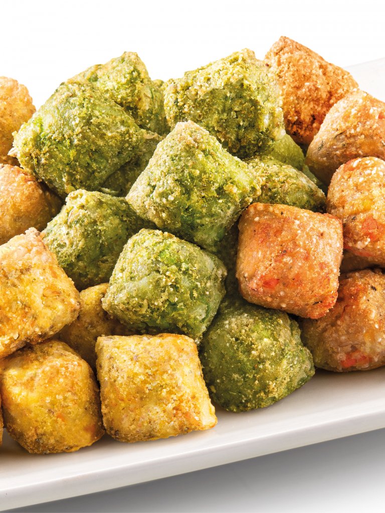 Appetitosi bocconcini di verdure da 10 grammi in tre sfiziosi gusti: polpettine verdi con lenticchie e broccoli, polpettine arancio con quinoa e zucca e polpettine gialle con cavolfiore e curcuma.