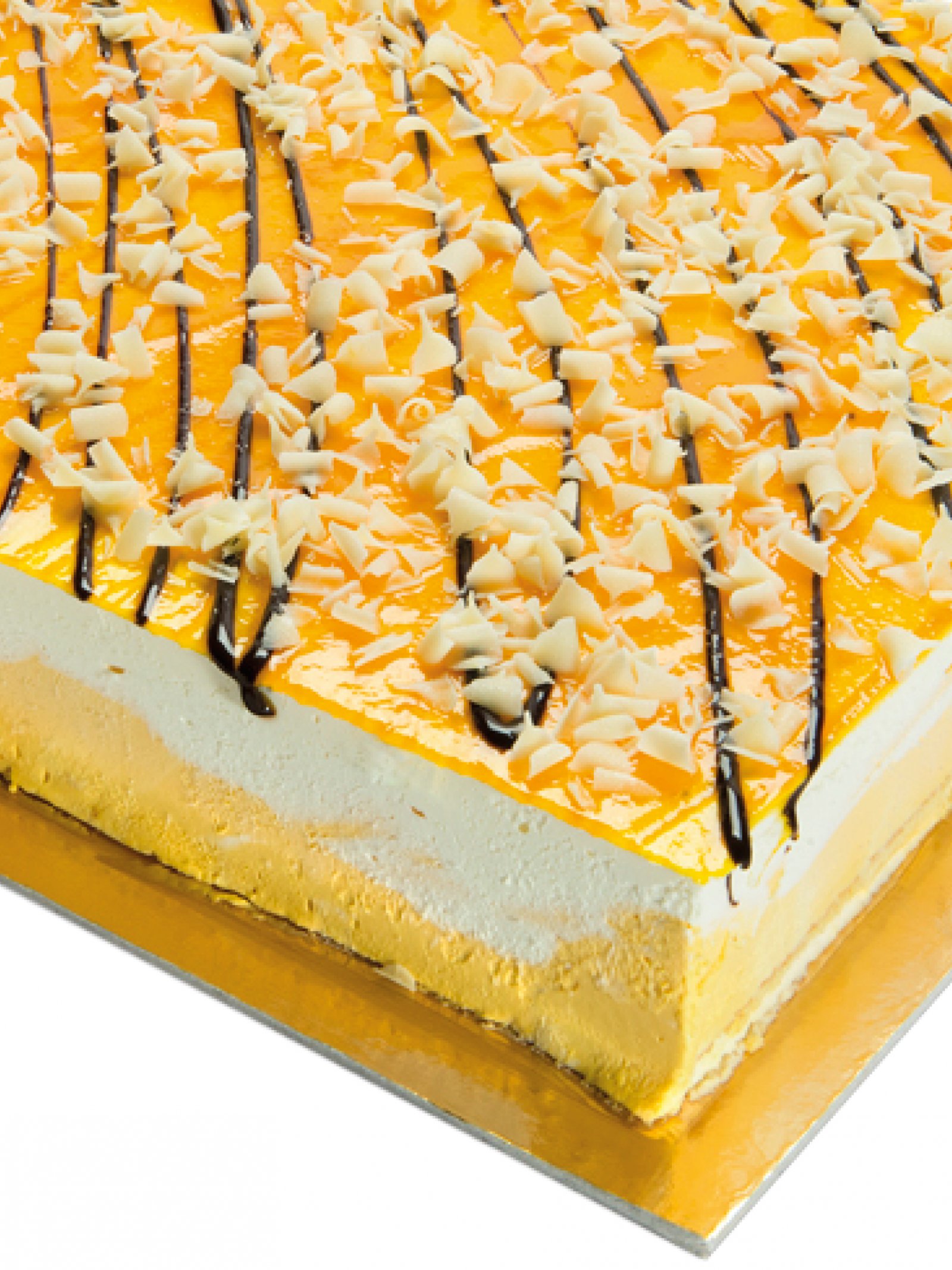 Strati di mousse all’arancio e fior di latte con pan di spagna, glassa agli agrumi e scaglie di cioccolato.