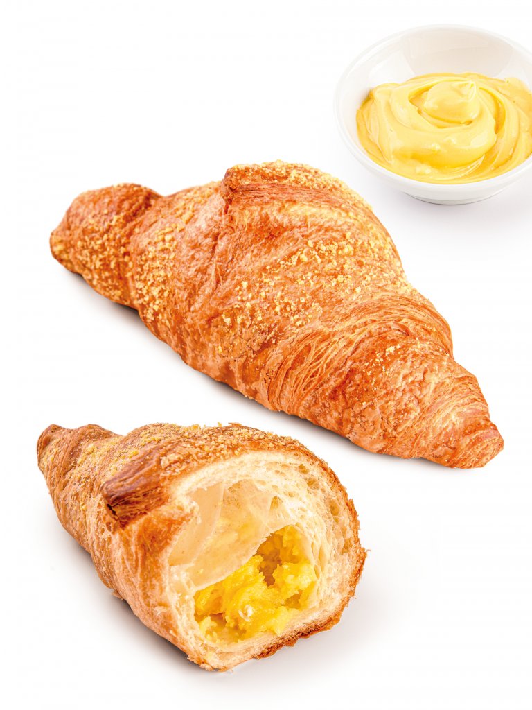 Croissant di ispirazione francese con pochi ingredienti di alta qualità. L'impasto ha un gusto abbastanza neutro, l'essenza del croissant è data dal burro conferendogli profumo, gusto e consistenza. L'alveolatura è molto aperta, irregolare, quasi vuota in alcuni punti. La sfoglia dorata e molto friabile all'esterno custodisce una farcitura di crema pasticcera da punta a punta donandogli un profumo di vaniglia. Decorato in superficie con zucchero semolato giallo.