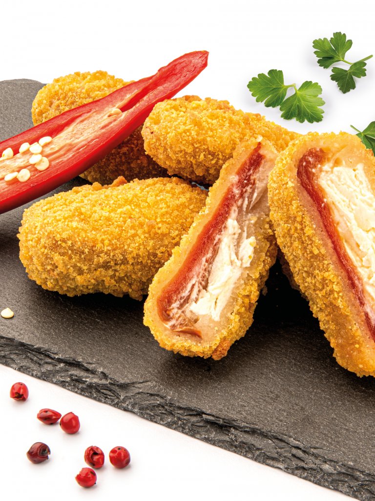 Peperoncini piccanti: il piccante deciso dei carnosi peperoncini jalapeño rossi è piacevolmente compensato da un cremoso e delicato ripieno di formaggio fresco. La croccante impanatura li rende un pratico snack da aperitivo.