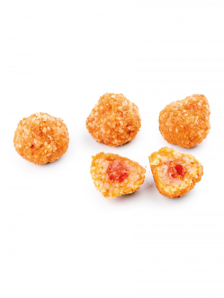 Mini arancini di riso dalla panatura croccante con ripieno di pomorodo e mozzarella.