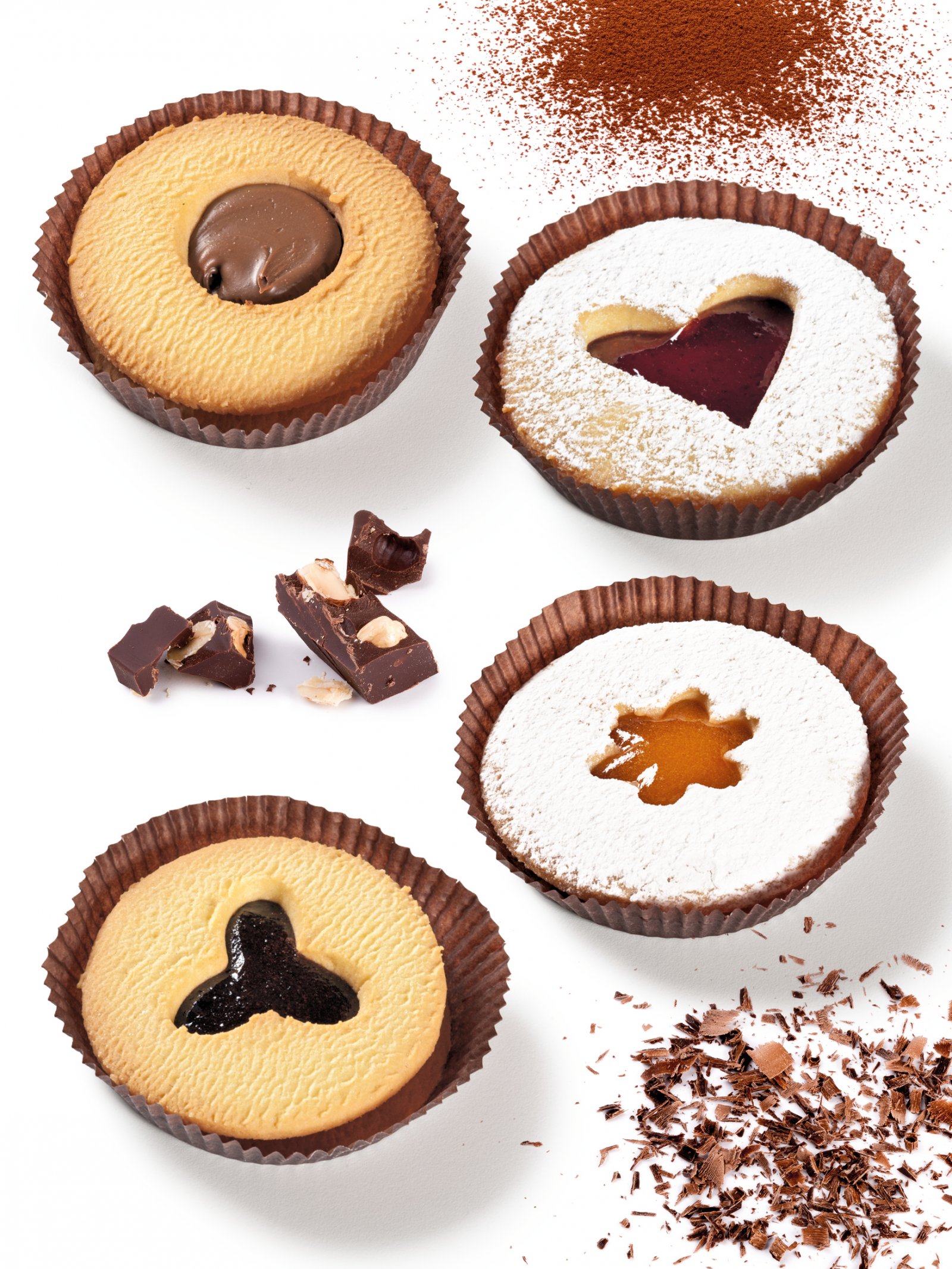 Biscotti di pasta frolla ripieni di dolci confetture e creme al cioccolato.