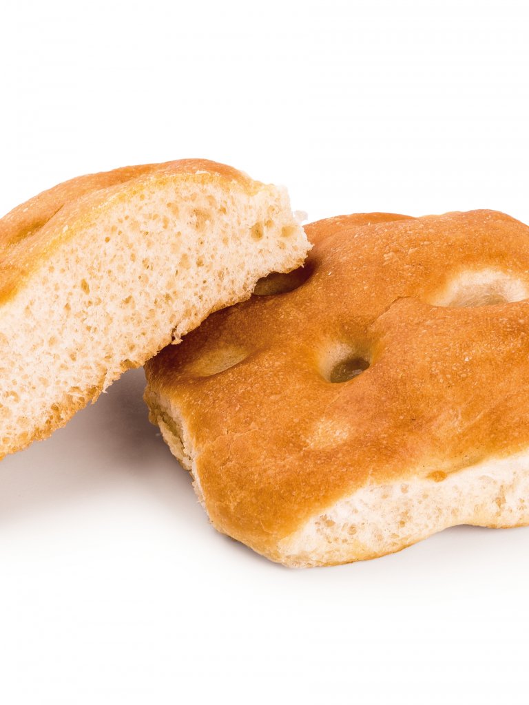 Focaccina mignon con impasto poco alveolato di farina di grano tenero e cereali maltati arricchito da olio extra vergine d'oliva che gli dona la giusta elasticità all'interno e croccantezza in superficie.