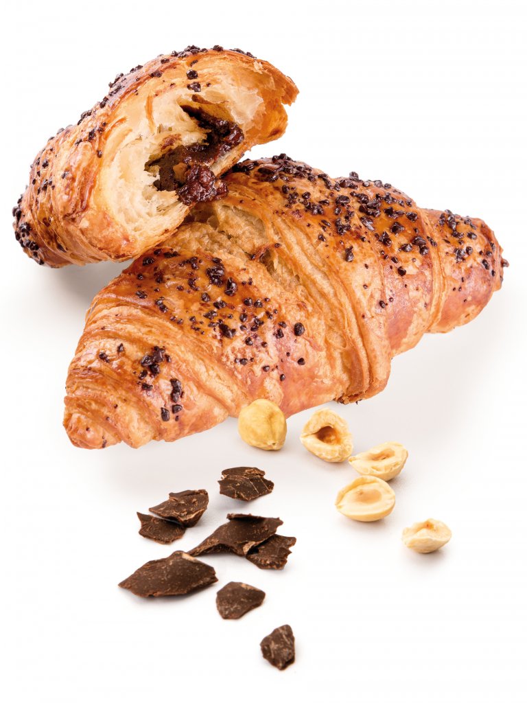 Gustosa farcitura alla crema di nocciole e cacao avvolta in un croissant leggero e finemente sfogliato grazie al lungo tempo di riposo dell'impasto e alla presenza del burro. L'uovo spennellato in superficie gli dona lucidità e doratura, il profumo di cioccolato e nocciole tostate è inconfondibile. Decorato in superficie con granella di cioccolato fondente.